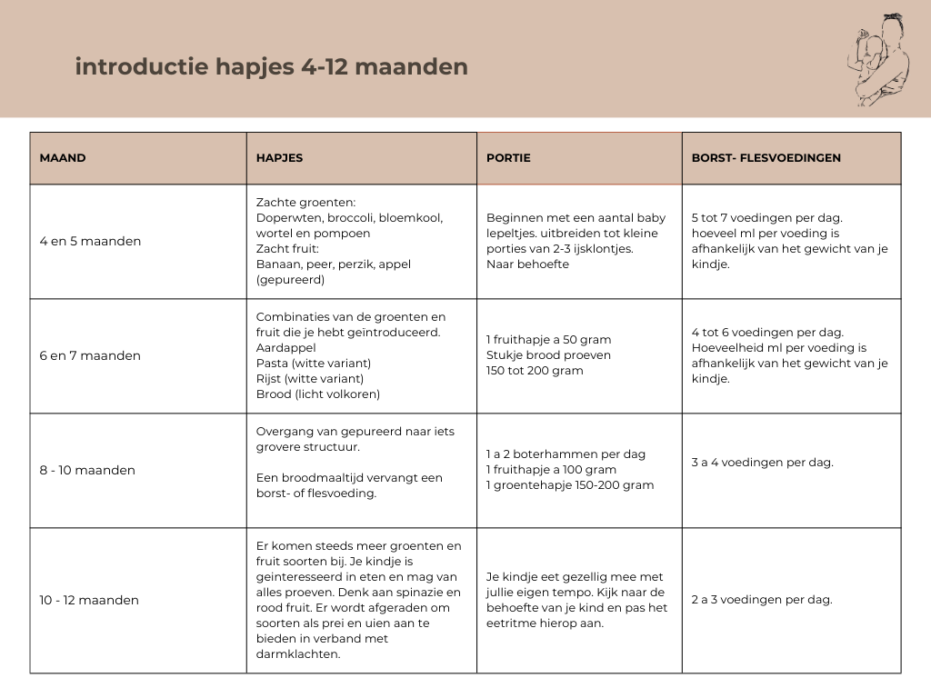 Wij hebben een handig voorbeeldschema gemaakt waarin precies staat wat je je kindje kan aanbieden en wat de hoeveelheden zijn. Deze kan je hieronder bekijken en downloaden.